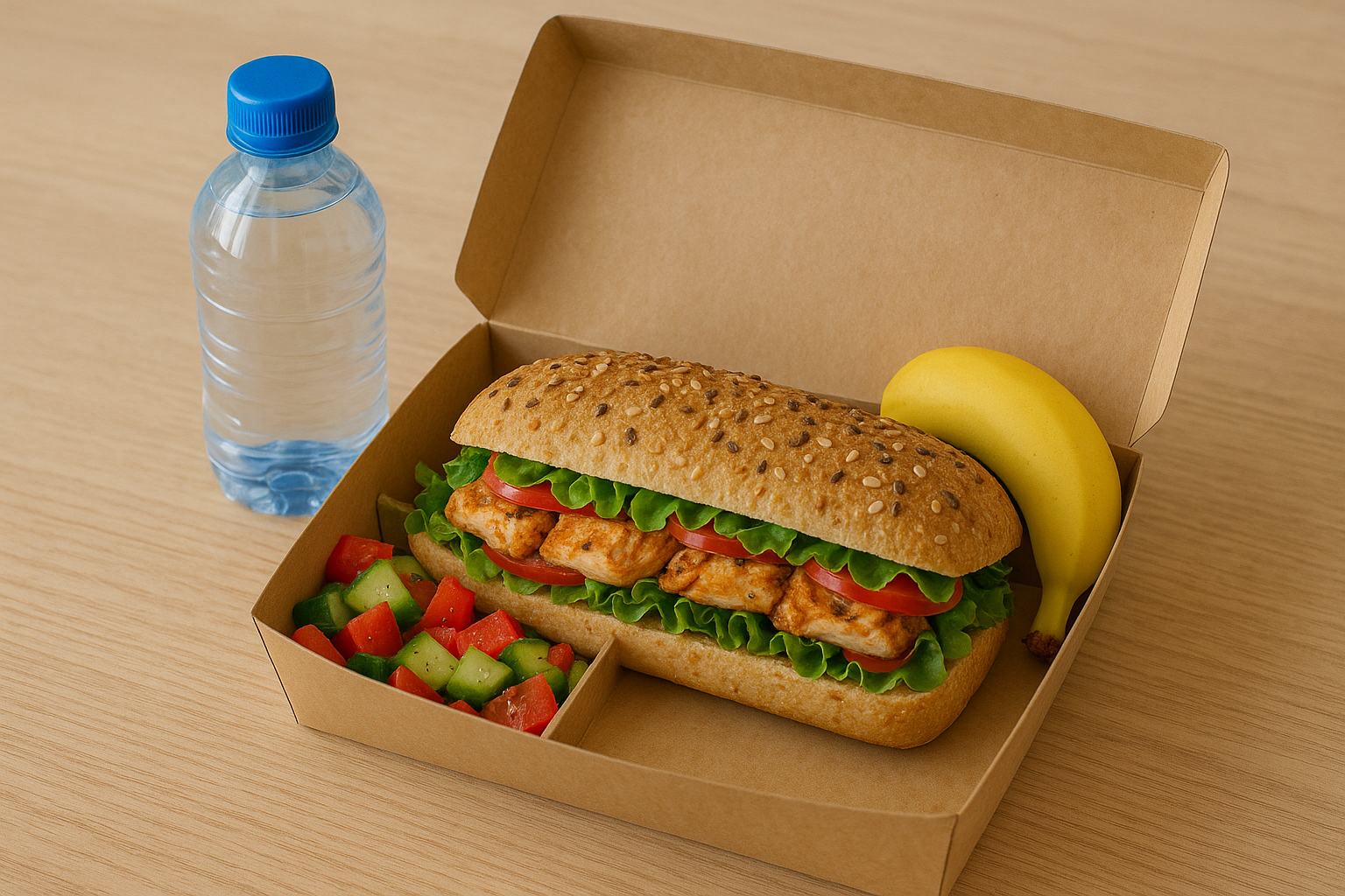 Sandwich poulet mariné, salade fraîche, fruit & eau– Boisson : Soda.