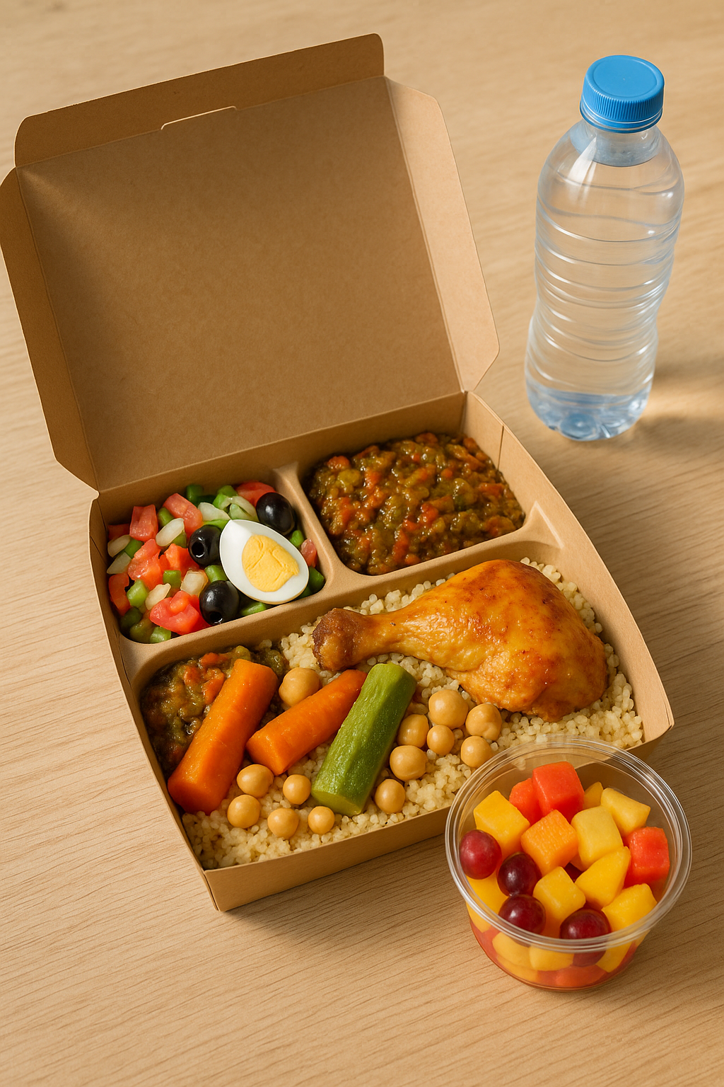 Couscous OU Lahmet thon OU Moussaka, salade tunisienne, salade de fruits & eau